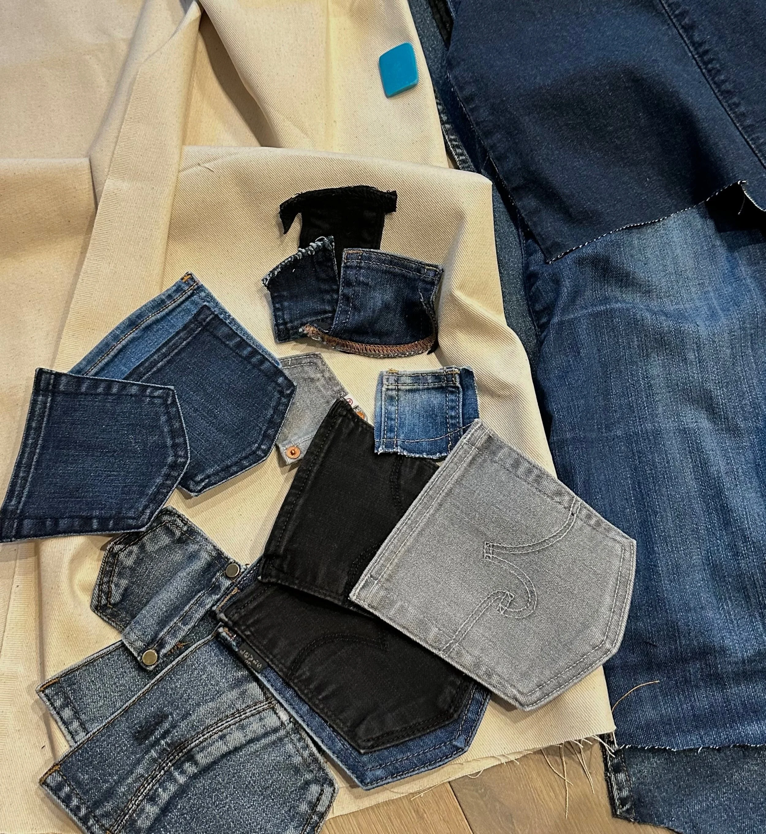 A: Our denim is sourced through donations of old jeans that are still in good condition from peers and community members. We prioritize using locally sourced materials to minimize our carbon footprint.